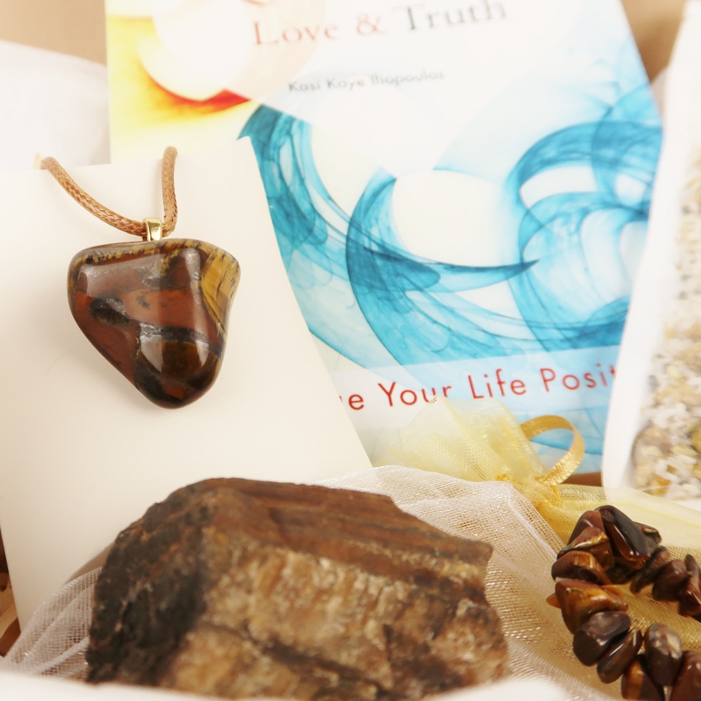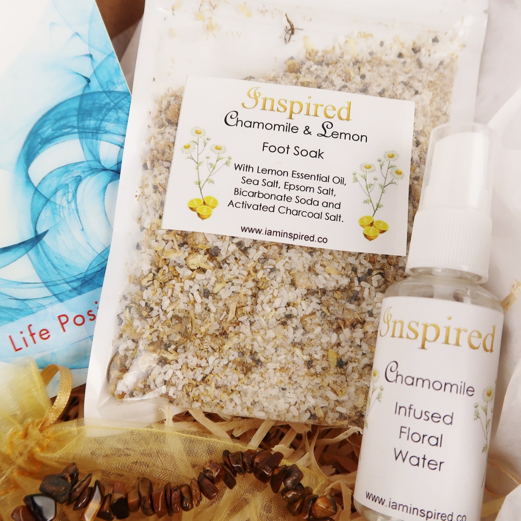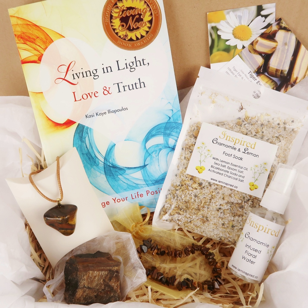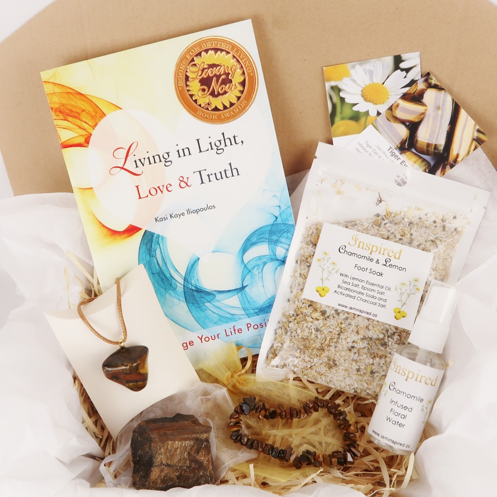 Theme: Calm What is in this INSPIRED Box? Total value $88 1. Living in Light, Love & Truth Paperback Book 2. Tiger Eye Pendant and Necklace 3. Tiger Eye Crystal Bracelet 4. Tiger Eye Raw Specimen 5. Chamomile Floral Water 6. Chamomile & Lemon Foot Soak 10. Chamomile and Tiger Eye Information Cards 11. Heart Thoughts Affirmation Card – Louise Hay
